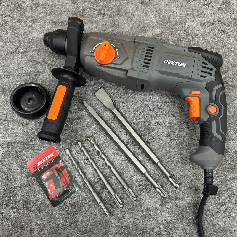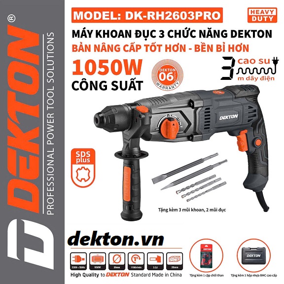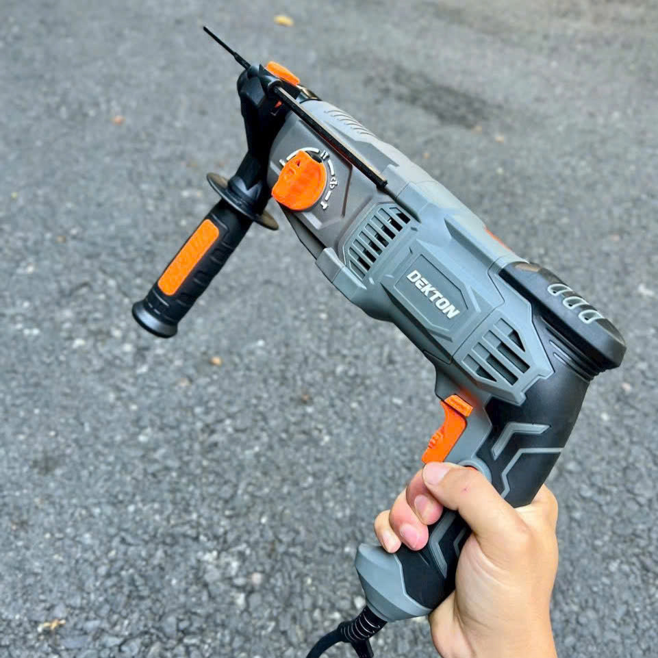 - Công suất cao và lực đập mạnh mẽ: Với công suất 1050W và lực đập 3.2J, máy khoan Dekton DK-RH2603PRO dễ dàng khoan bê tông với đường kính lên tới 26mm, đảm bảo hiệu quả và tiết kiệm thời gian làm việc.
