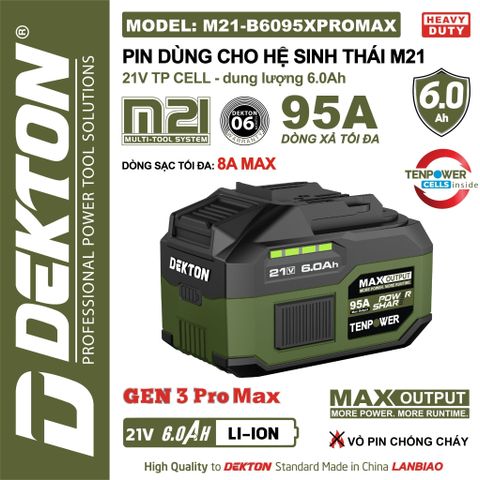 6.5Ah Pin 15CELL DEKTON M21-B6095XPROMAX là giải pháp năng lượng tiên tiến, được thiết kế đặc biệt dành cho các thiết bị cầm tay chạy pin trong ngành công nghiệp và xây dựng. Với dung lượng lớn 6.5Ah cùng dòng xả tối đa 95A, sản phẩm đảm bảo cung cấp hiệu suất mạnh mẽ và ổn định, giúp bạn hoàn thành công việc một cách hiệu quả và liên tục.