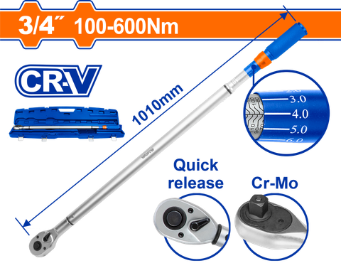 Cờ Lê Lực WADFOW WWQ3D34 là dụng cụ cầm tay chuyên dụng được thiết kế để đo và siết lực mô-men xoắn chính xác trong phạm vi từ 100 đến 600 N·m. Sản phẩm thuộc dòng cờ lê lực chất lượng cao, được sử dụng phổ biến trong các ngành công nghiệp ô tô, cơ khí, xây dựng và bảo trì thiết bị.