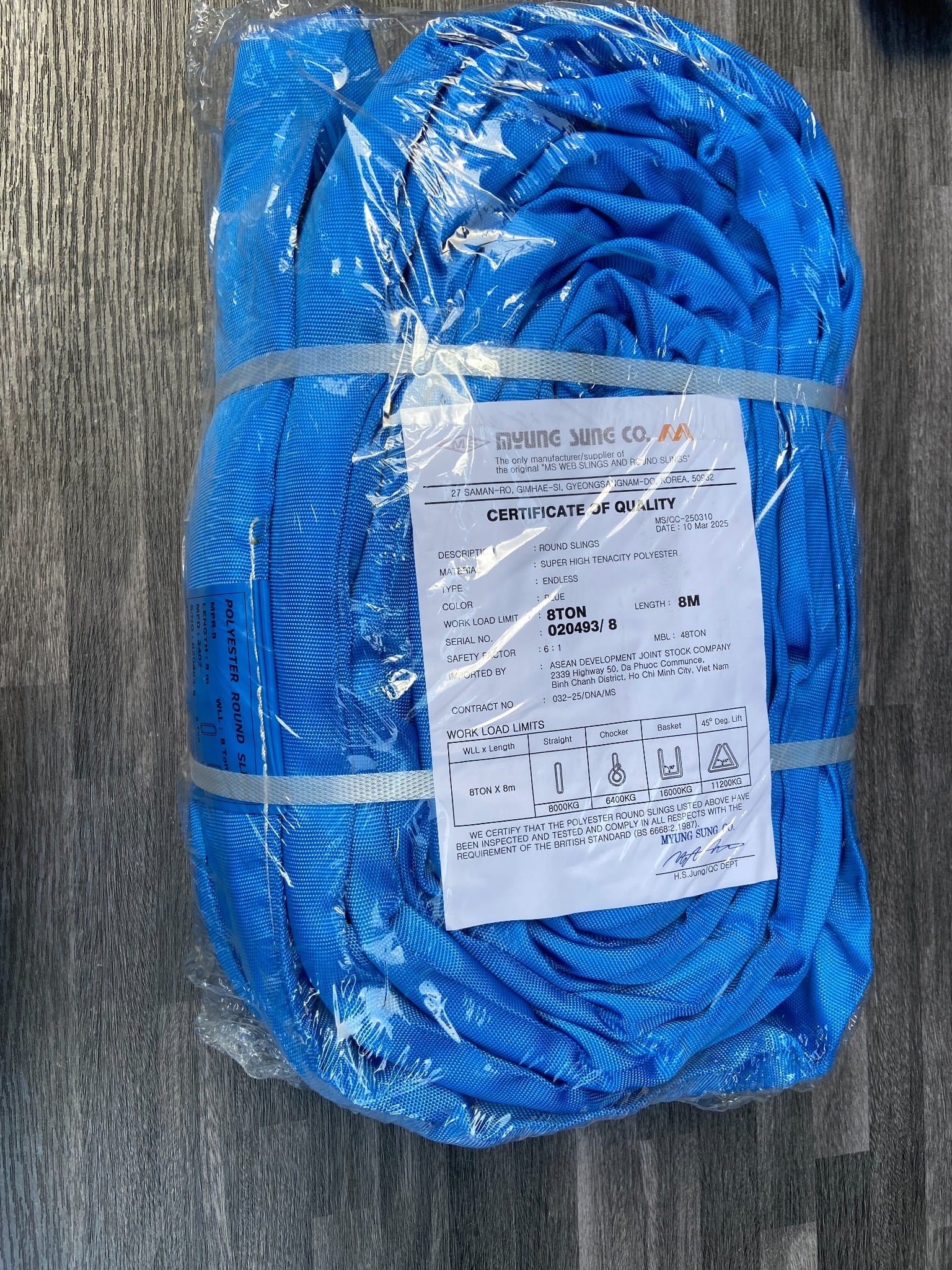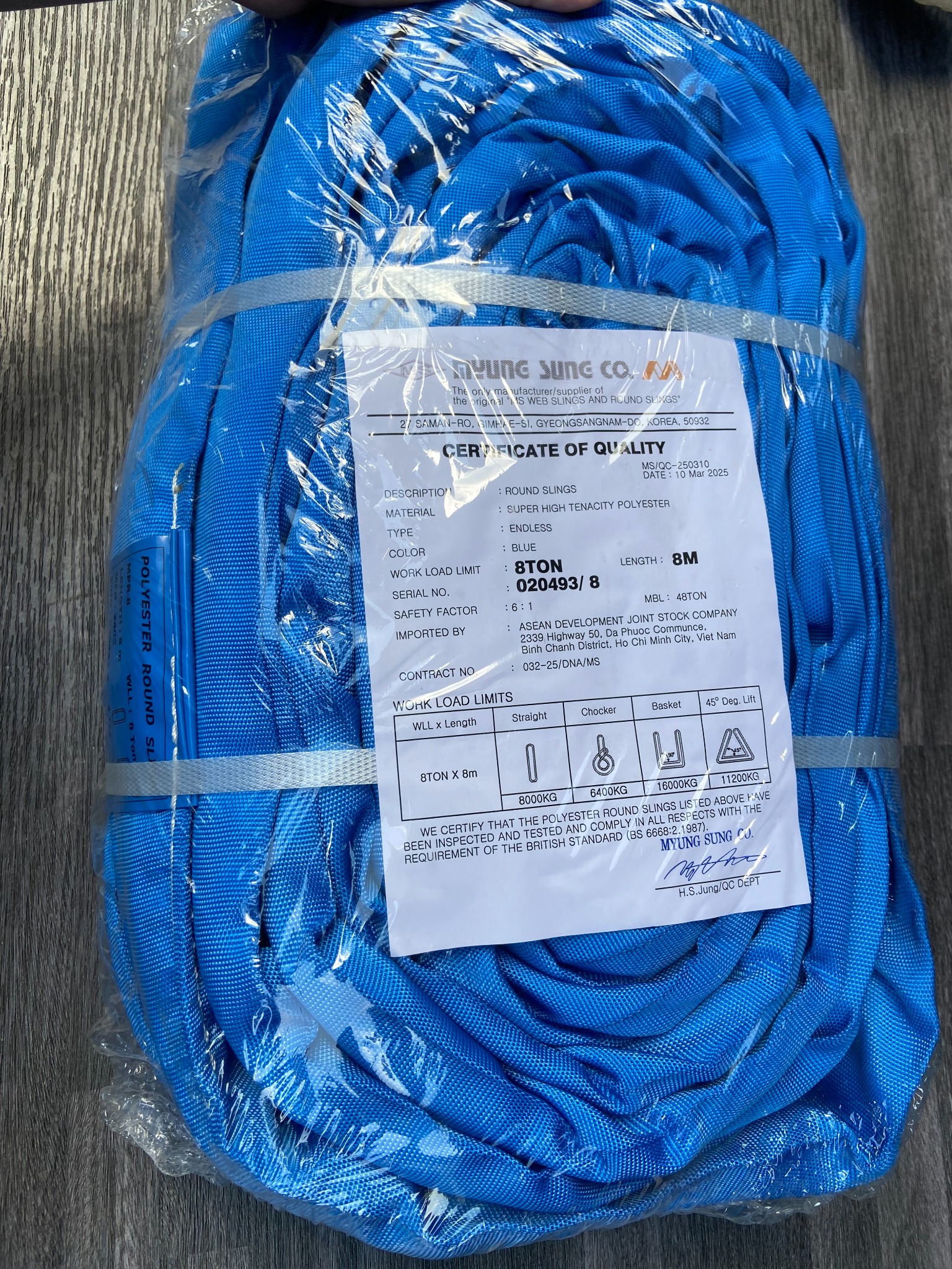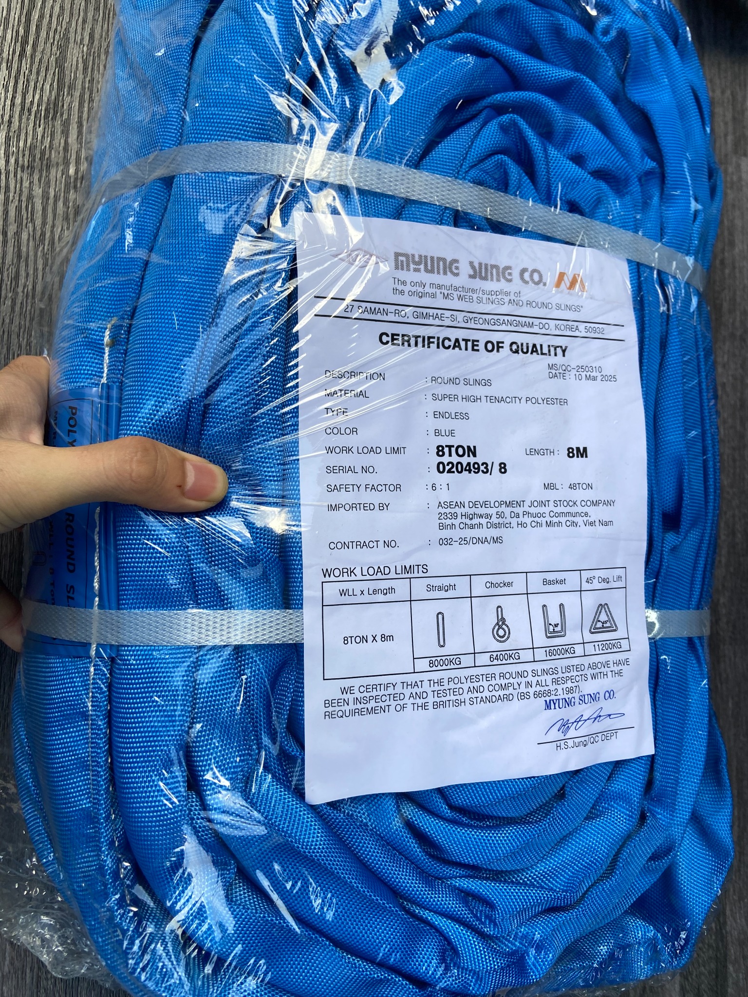 Dây cáp cẩu vải bản tròn (Roundsling Endless) là một trong những thiết bị cầm tay không thể thiếu trong lĩnh vực nâng hạ, vận chuyển hàng hóa nặng. Sản phẩm với tải trọng làm việc lên tới 8 tấn và chiều dài 8 mét, được sản xuất tại Hàn Quốc với tiêu chuẩn HS 6:1, đảm bảo an toàn tối đa trong các công việc nâng hạ công nghiệp.
