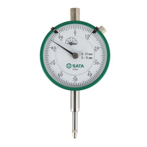 Hình ảnh sản phẩm là đồng hồ so cơ học (dial indicator) thương hiệu SATA, model 91561, được thiết kế chuyên dụng để đo độ chính xác cao trong phạm vi từ 0 đến 5 mm với độ chia nhỏ nhất là 0,01 mm. Thân đồng hồ tròn với mặt hiển thị lớn nền trắng, kim chỉ màu đen nổi bật và viền ngoài xanh lá cây có rãnh tăng độ bám. Mặt đồng hồ phụ giúp đếm số vòng quay kim lớn, mặt kính trong suốt chống trầy xước bảo vệ màn hình đo. Thân và trục đo bằng thép không gỉ chắc chắn, phù hợp cho các môi trường làm việc công nghiệp.