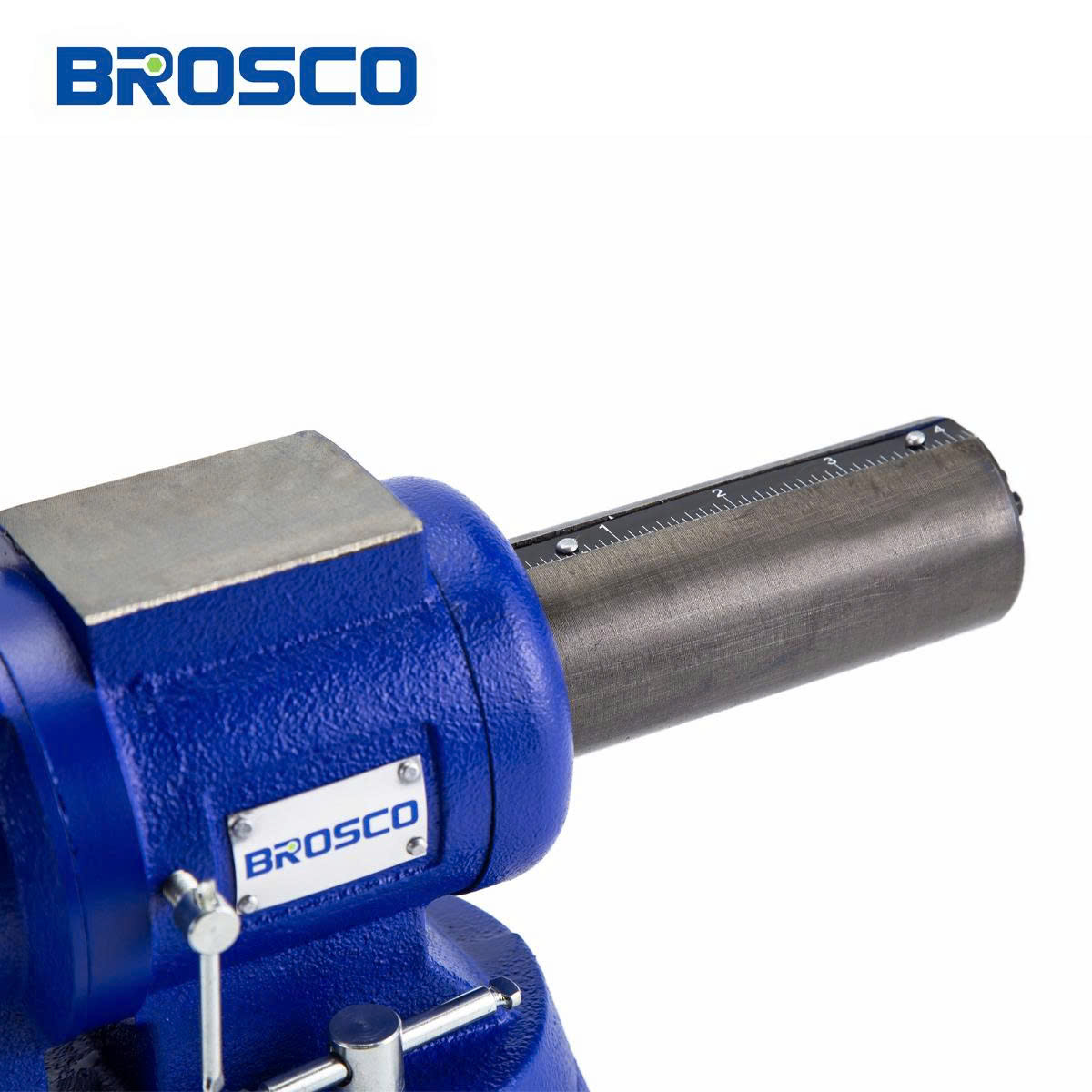 Hình ảnh sản phẩm thể hiện rõ chiếc ê tô bàn làm việc hạng nặng thương hiệu Brosco với thiết kế chắc chắn và chuyên nghiệp. Sản phẩm nổi bật với phần thân và hàm kẹp làm từ thép dẻo và thép tôi cứng, được sơn phủ màu xanh dương sang trọng, vừa tăng tính thẩm mỹ vừa chống gỉ sét hiệu quả. Cơ chế trụ quay 360° giúp điều chỉnh góc kẹp linh hoạt, cùng tay quay kim loại chắc chắn hỗ trợ mở rộng hàm kẹp tối đa 125mm, phù hợp với nhiều kích thước vật liệu khác nhau.