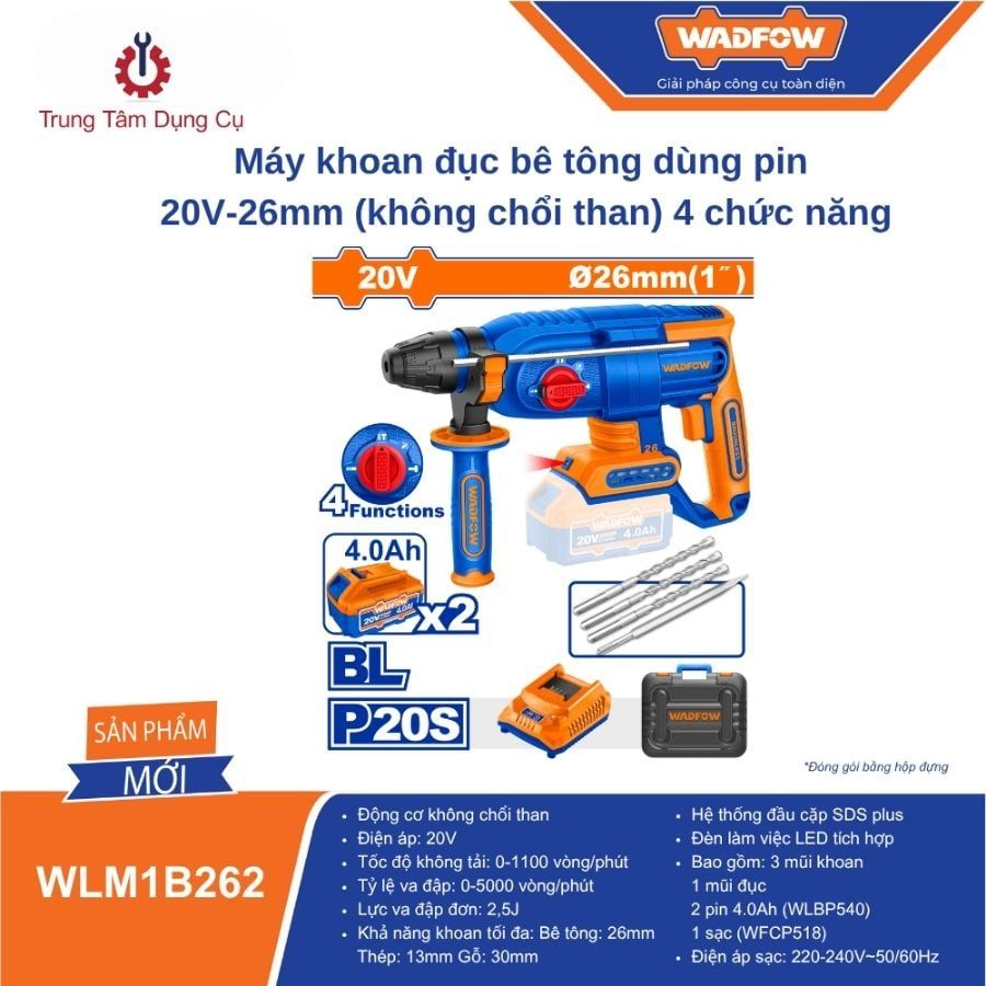 Giới thiệu sản phẩm Máy khoan đục bê tông dùng pin 20V-26mm WADFOW WLM1B262