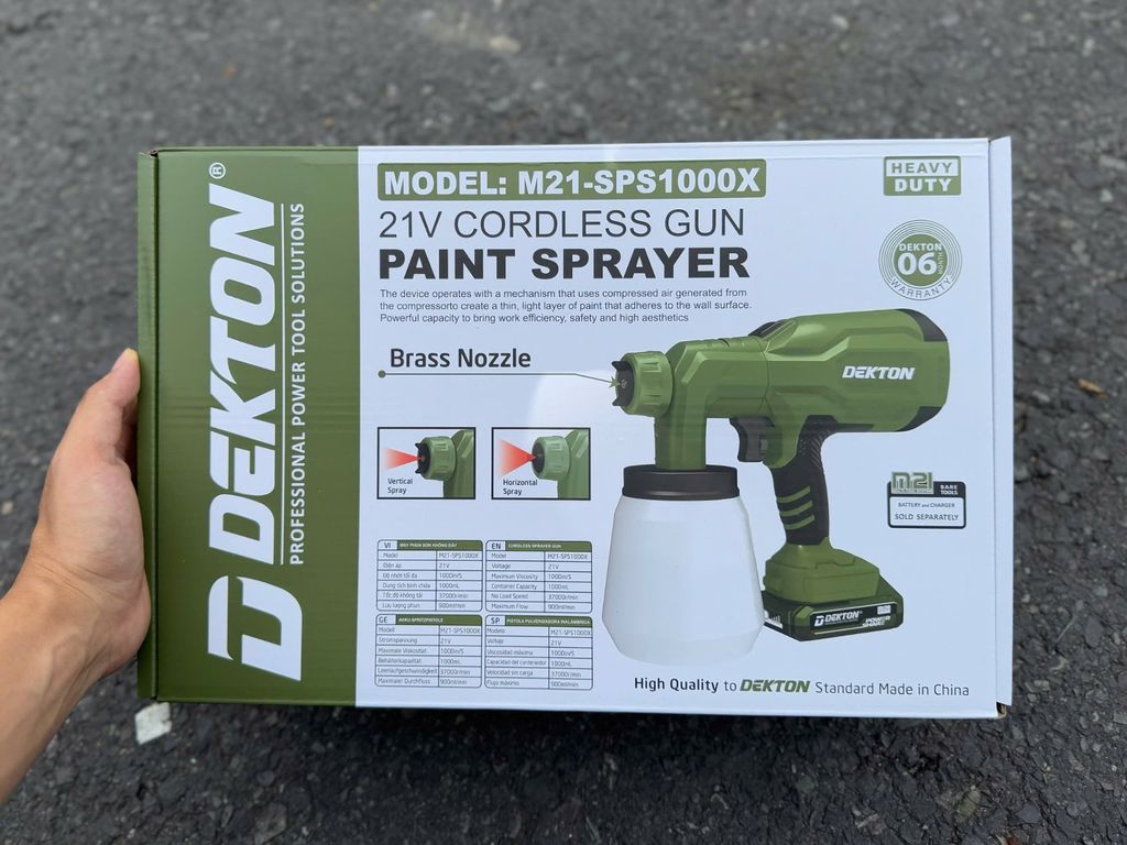 Máy phun sơn cầm tay hoạt động bằng pin DEKTON M21-SPS1000X là thiết bị phun sơn hiện đại, được thiết kế nhằm đáp ứng nhu cầu phun sơn nhanh chóng, hiệu quả và tiện lợi cho các công việc từ gia đình, sửa chữa nhỏ đến các dự án thi công chuyên nghiệp. Sản phẩm thuộc dòng máy dùng pin 21V hiện đại, giúp người dùng dễ dàng di chuyển, thao tác mà không bị giới hạn bởi dây điện hay nguồn điện cố định.